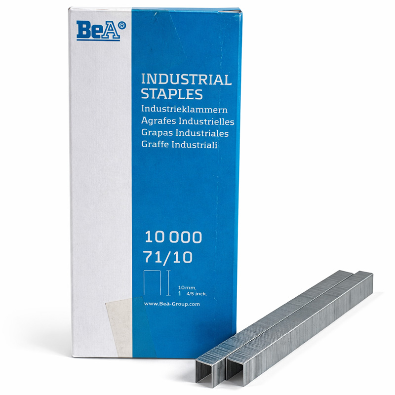 The BeA 71/10 staples are fine-wire tacker staples designed for light- to medium-duty stapling tasks — especially useful for upholstery, insulation backing, sheathing, light paneling, fabric attachment, and general-purpose stapling. With a 3/8" (10 mm) leg length and 3/8" crown, they provide enough penetration for securing materials to wood or thin substrate without excessive depth, making them suitable for jobs needing a clean finish and secure hold.